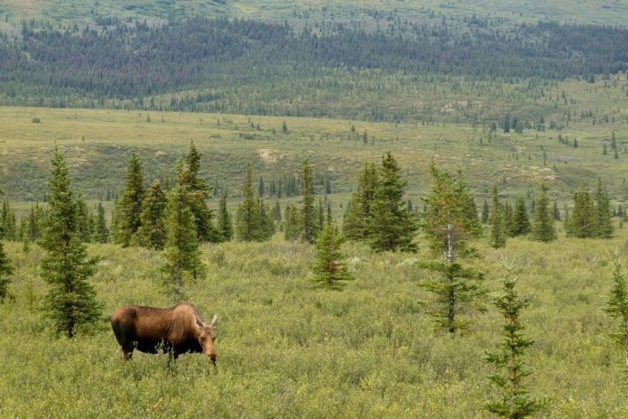 A moose looks over vegetation on Monday, Aug. 11, 2025, in Denali National Park and Preserve, Alaska. (AP Photo/Becky Bohrer)