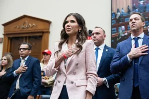 Homeland Security Secretary Kristi Noem took to the podium to speak at a...