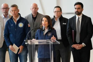 Transportation Secretary Sean Duffy, Gov. Kathy Hochul (D-NY), and New York City Mayor...
