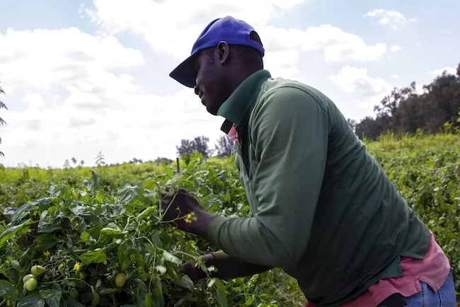 In this March 24, 2021, photo, a farmworker harvests tomatoes at a farm in Delray Beach, Florida. (AP Photo/Cody Jackson)