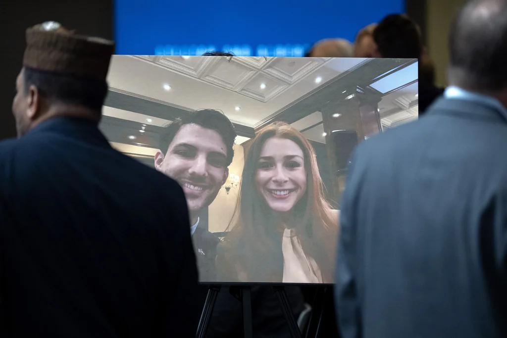 Visitors walk past a photo of slain Israeli Embassy staff members Yaron Lischinsky, left, and Sarah Milgrim, right, before a service to mark the reopening of the Capital Jewish Museum after the two were killed following an event at the museum, Thursday, May 29, 2025, in Washington. (AP Photo/Mark Schiefelbein)