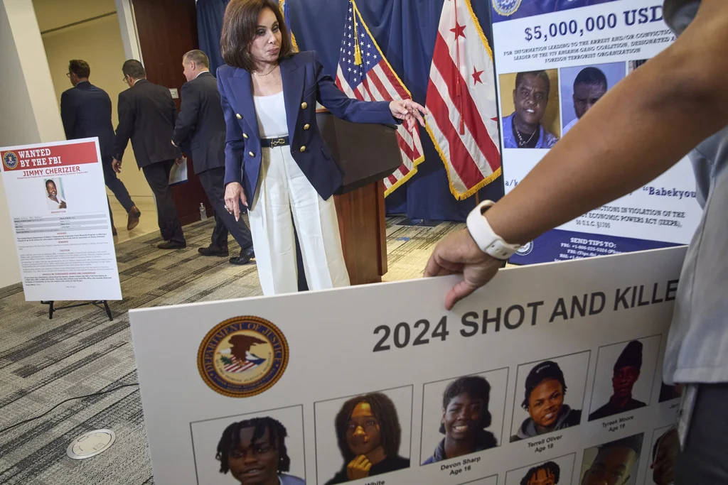 U.S. Attorney for the District of Columbia Jeanine Pirro asks to change the posters from the indictment of an alleged Haitian gang leader to victims of gun murders in Washington in 2024 and 2025, Tuesday, Aug. 12, 2025, during a news conference at the U.S. Attorney’s office in Washington. (AP Photo/Jacquelyn Martin)