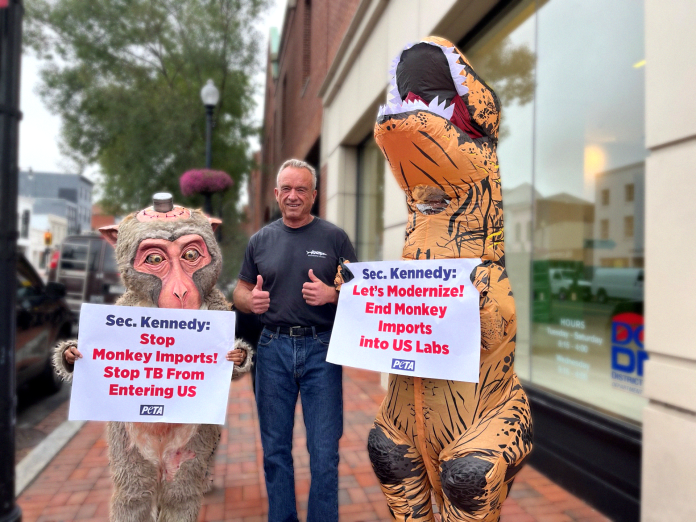 In the photos provided by PETA, Kennedy is shown smiling and flashing a thumbs-up next to the mascots holding signs reading “Sec: Kennedy Stop Monkey Imports! Stop TB From Entering US” and “Sec: Kennedy Let’s Modernize! End Monkey Imports into US Labs.”