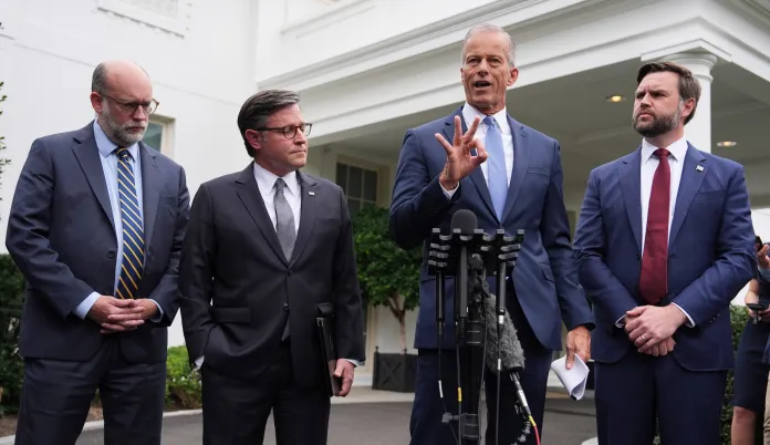Senate Majority Leader John Thune, R-S.D., speaks alongside Russell Vought, Office of Management and Budget director, from left, House Speaker Mike Johnson, R-La., and Vice President JD Vance, as they address members of the media outside the West Wing at the White House in Washington, Monday, Sept. 29, 2025, in Washington.