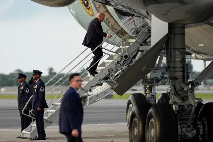 Photos released on Sunday night show Trump using the shorter, retractable stairs at the belly of the plane, as he heads back to Washington, D.C., following a weekend at his Mar-a-Lago resort. He did not take questions from reporters before departing, as he typically does, and his schedule indicates he left Palm Beach slightly later than expected.