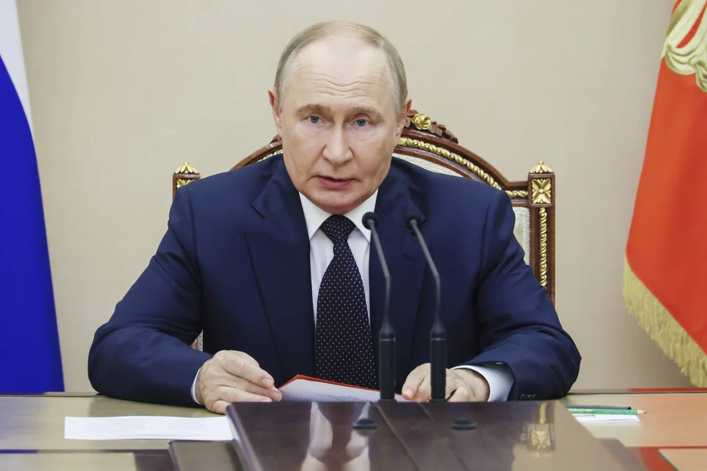 Russian President Vladimir Putin chairs the Security Council meeting on Friday, Aug. 8, 2025, at the Kremlin in Moscow. (Mikhail Metzel, Sputnik, Kremlin Pool Photo via AP)