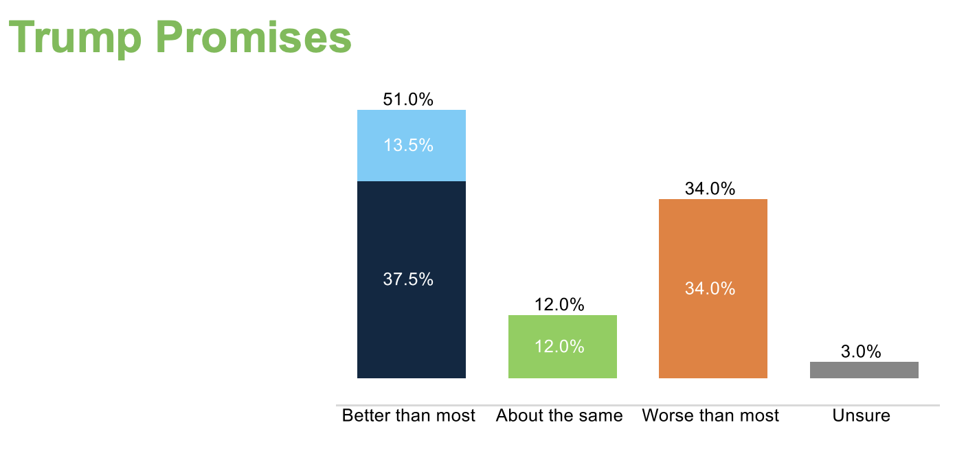 In a new Cygnal survey shared with Secrets on Wednesday, half of voters said that Trump makes good on campaign promises “better than most politicians.” And a sizable 38% said that he does so “much better than most.”