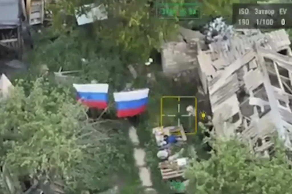 In this photo taken from a video released by the Russian Defense Ministry press service on Saturday, May 24, 2025, Russian servicemen hold Russian national flags in Otradne after Russian forces reported they captured the settlement in Ukraine. (Russian Defense Ministry Press Service via AP)