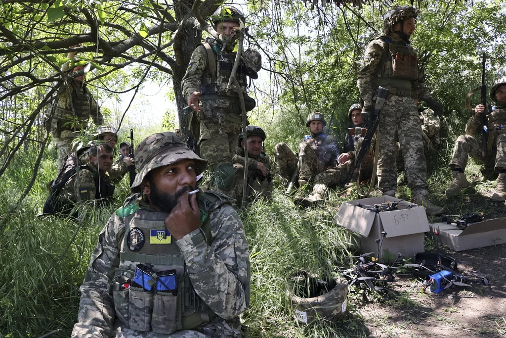 In this photo provided by Ukraine’s 65th Mechanized Brigade press service, Ukrainian servicemen rest after practicing at the military training ground in the Zaporizhzhia region, Ukraine, Thursday, May 22, 2025. (Andriy Andriyenko/Ukraine’s 65th Mechanized Brigade via AP)