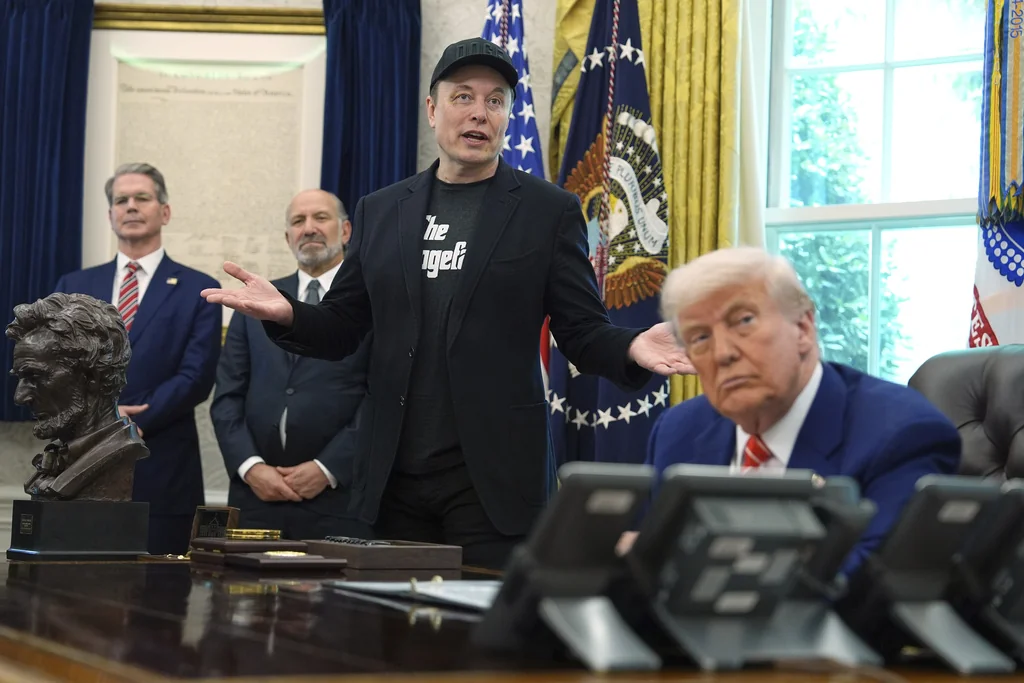 Elon Musk speaks during a news conference with President Donald Trump, right, as Treasury Secretary Scott Bessent, from left, and Commerce Secretary Howard Lutnick, listen in the Oval Office of the White House, Friday, May 30, 2025, in Washington. (AP Photo/Evan Vucci)