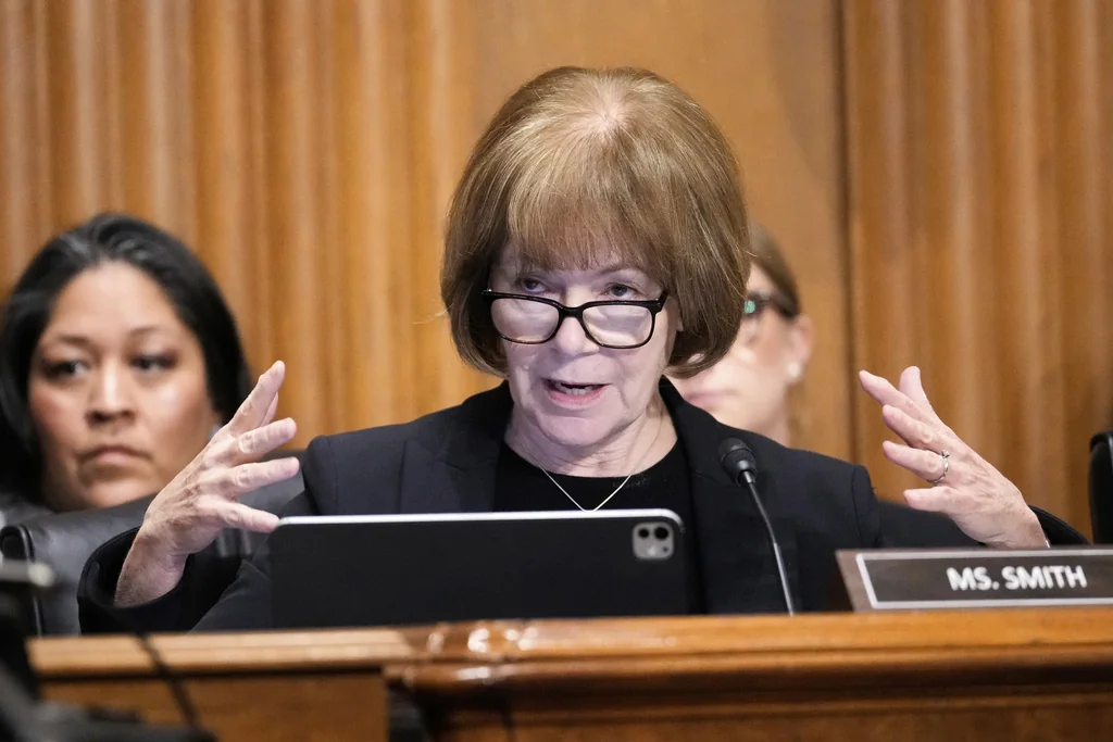 Sen. Tina Smith (D-MN) is pictured during a Senate Finance Committee confirmation hearing on Capitol Hill in Washington, Friday, March 14, 2025. (AP Photo/Ben Curtis)