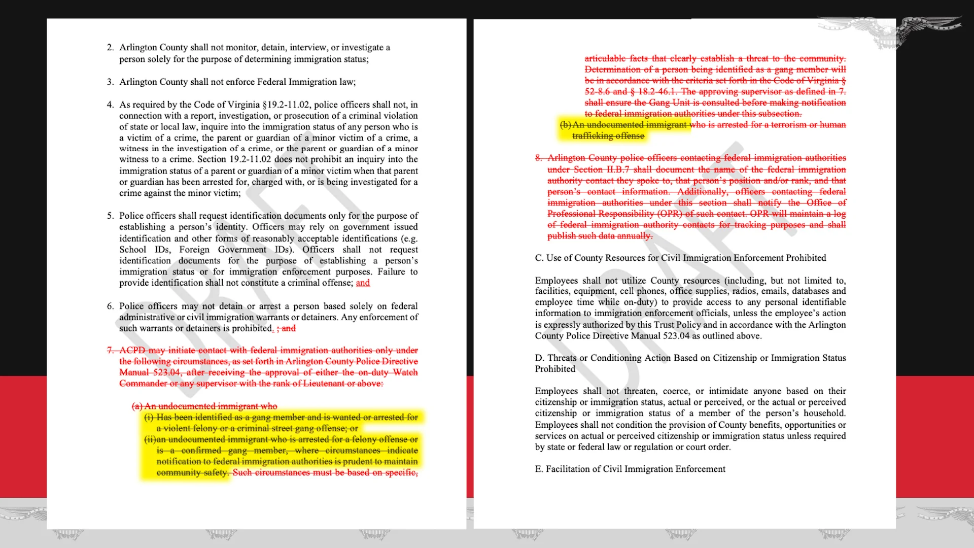 The draft released from the county board meeting vote on Tuesday, May 13, shows Section 7 crossed out. It previously allowed police to contact ICE under three circumstances: if the person is here illegally and has been identified as a gang member who has committed a criminal gang offense; if an illegal immigrant has committed a violent felony and is considered a threat to the community; or if an illegal immigrant is arrested for human trafficking or a terrorist attack.