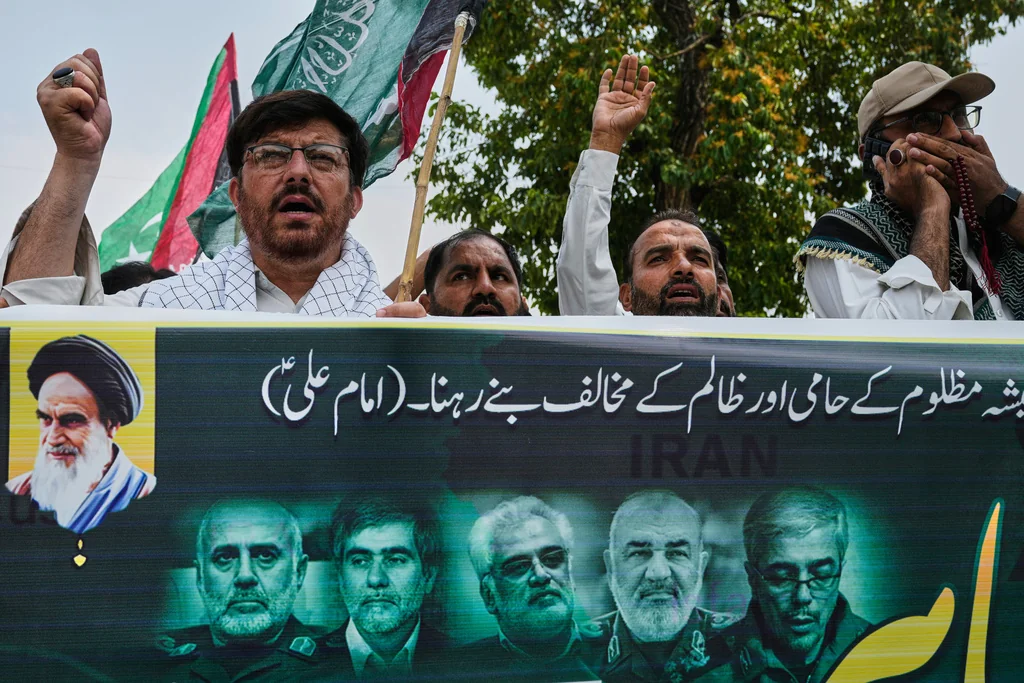 Shiite Muslims chant anti-Israel slogans during a demonstration in Islamabad, Pakistan, to condemn Israeli strikes on Iran, Friday, June 13, 2025. The banner in the Urdu language reads, “Always be a supporter of the oppressed and an opponent of the oppressor.”(AP Photo/Anjum Naveed)