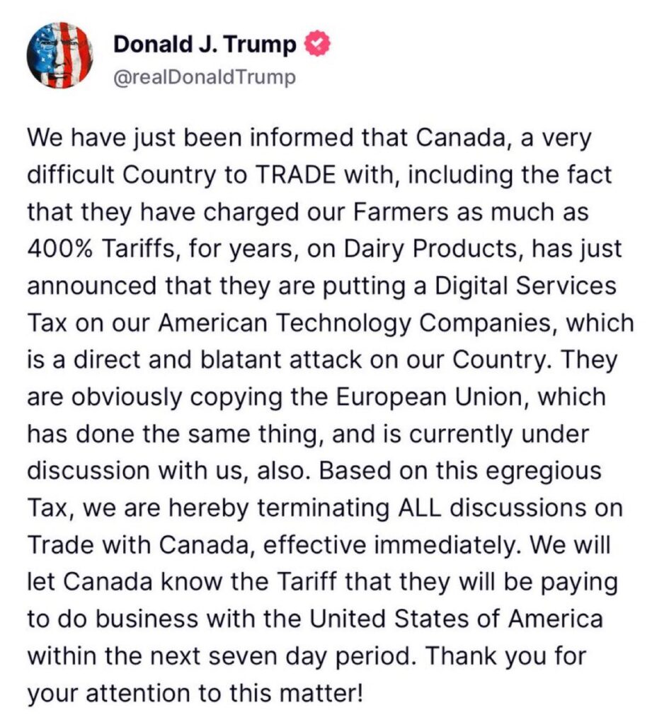 “We have just been informed that Canada, a very difficult Country to TRADE with, including the fact that they have charged our Farmers as much as 400% Tariffs, for years, on Dairy Products, has just announced that they are putting a Digital Services Tax on our American Technology Companies, which is a direct and blatant attack on our Country,” the president said on Truth Social.