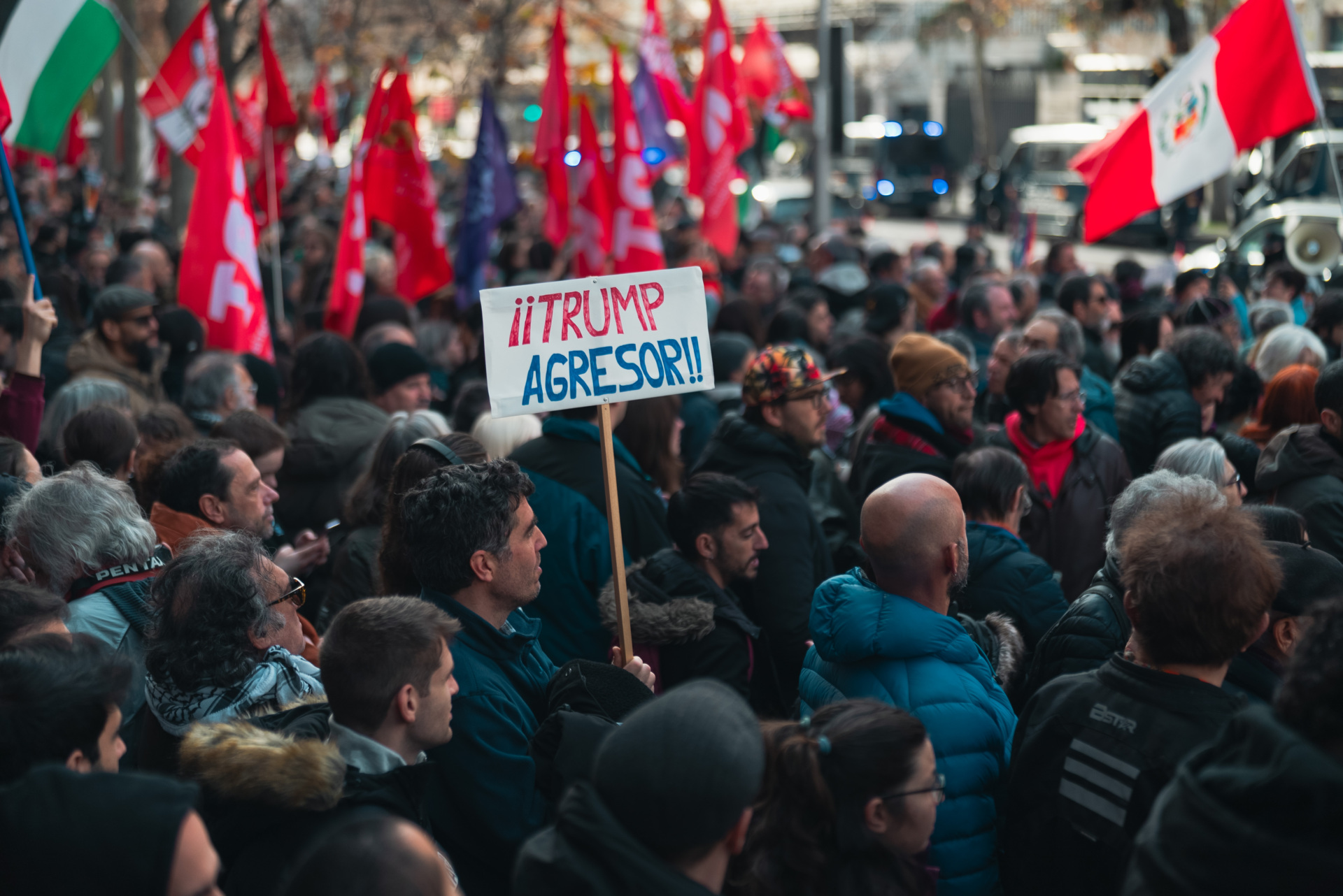 Leftist protesters in Madrid chanted slogans such as “Out with the criminal gringo!”, “We don’t want to be an American colony!” and “Out with the Nazi murderers!”, El País reported.