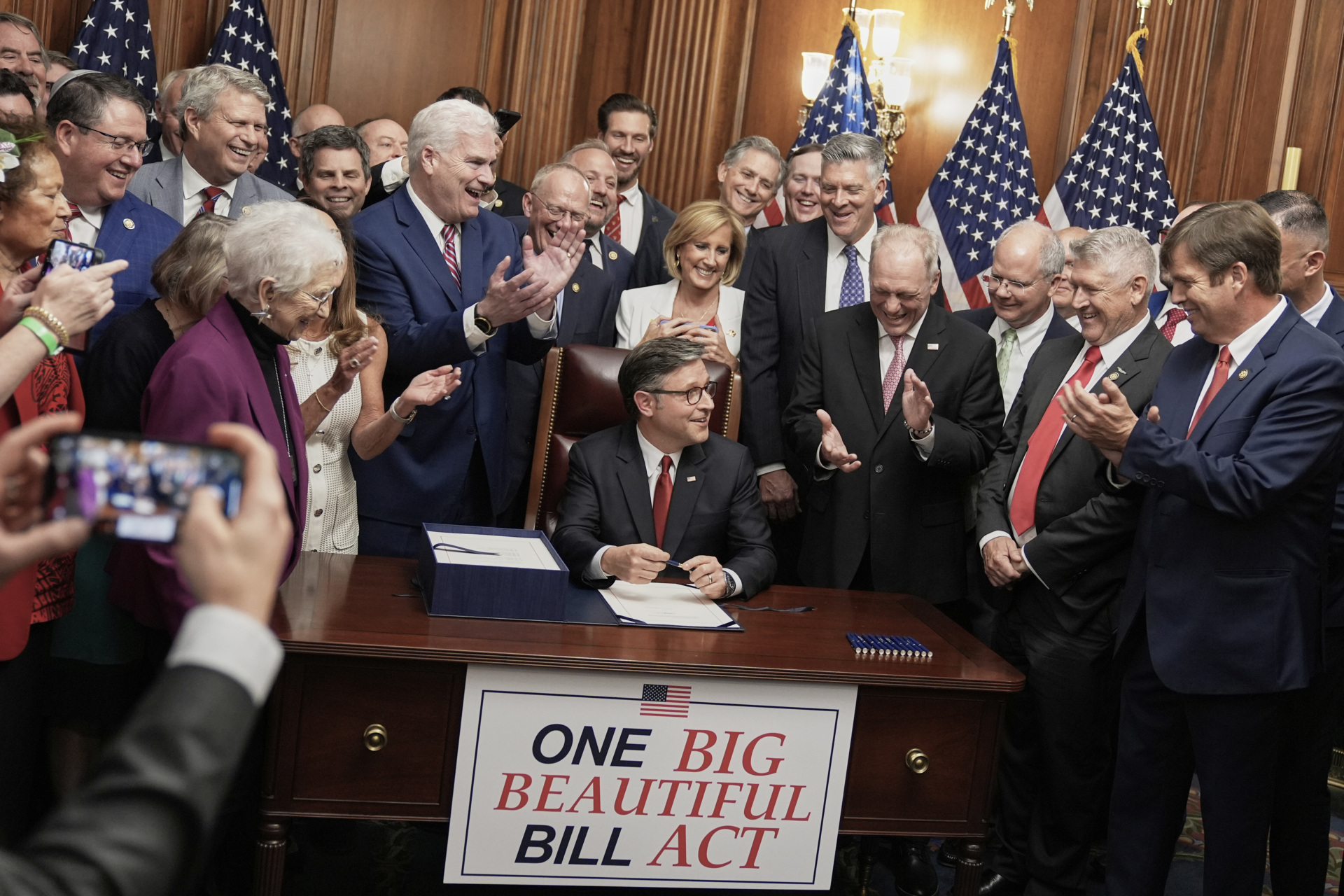 Speaker of the House Mike Johnson (R-LA), center, surrounded by fellow Republicans, signs President Donald Trump’s signature bill of tax breaks and spending cuts on July 3, 2025, at the Capitol in Washington. (AP Photo/Mariam Zuhaib)