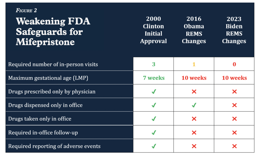 Following actions from the Obama and Biden administrations, the drug’s current Risk Evaluation and Mitigation Strategy (REMS), which has been in effect since 2023 allows women to obtain mifepristone with one telehealth visit with any approved healthcare provider (not necessarily a physician), allows women to self-administer the drugs obtained from a mail-order pharmacy, and allows women to take the drugs up to ten weeks gestation instead of seven weeks.