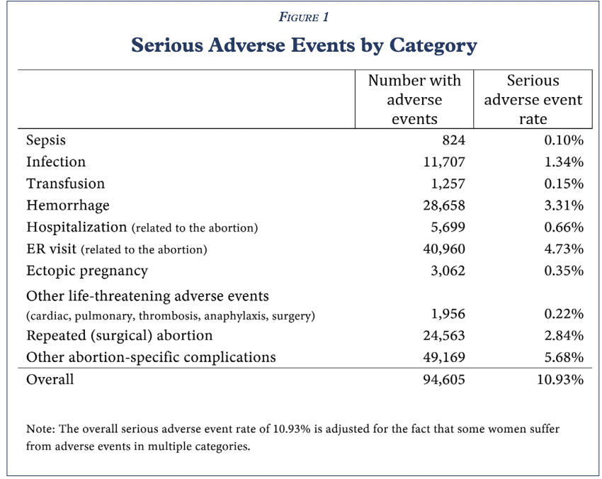 A study from the Ethics and Public Policy Center released on Monday found that 10.93 percent of women who had mifepristone abortions — the first drug used in a two-drug medication abortion regimen — experienced severe complications including sepsis, infection, hemorrhaging, or another serious adverse event within 45 days following the abortion. This percentage is significantly higher than the less than 0.5 percent in clinical trials reported on the FDA-approved drug label.