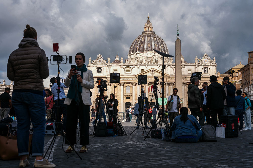 Journalists work at St Peter’s Square with the St Peter’s basilica in the background, ahead of the second voting session of the conclave, in the Vatican on May 8, 2025. (DIMITAR DILKOFF/AFP via Getty Images)
