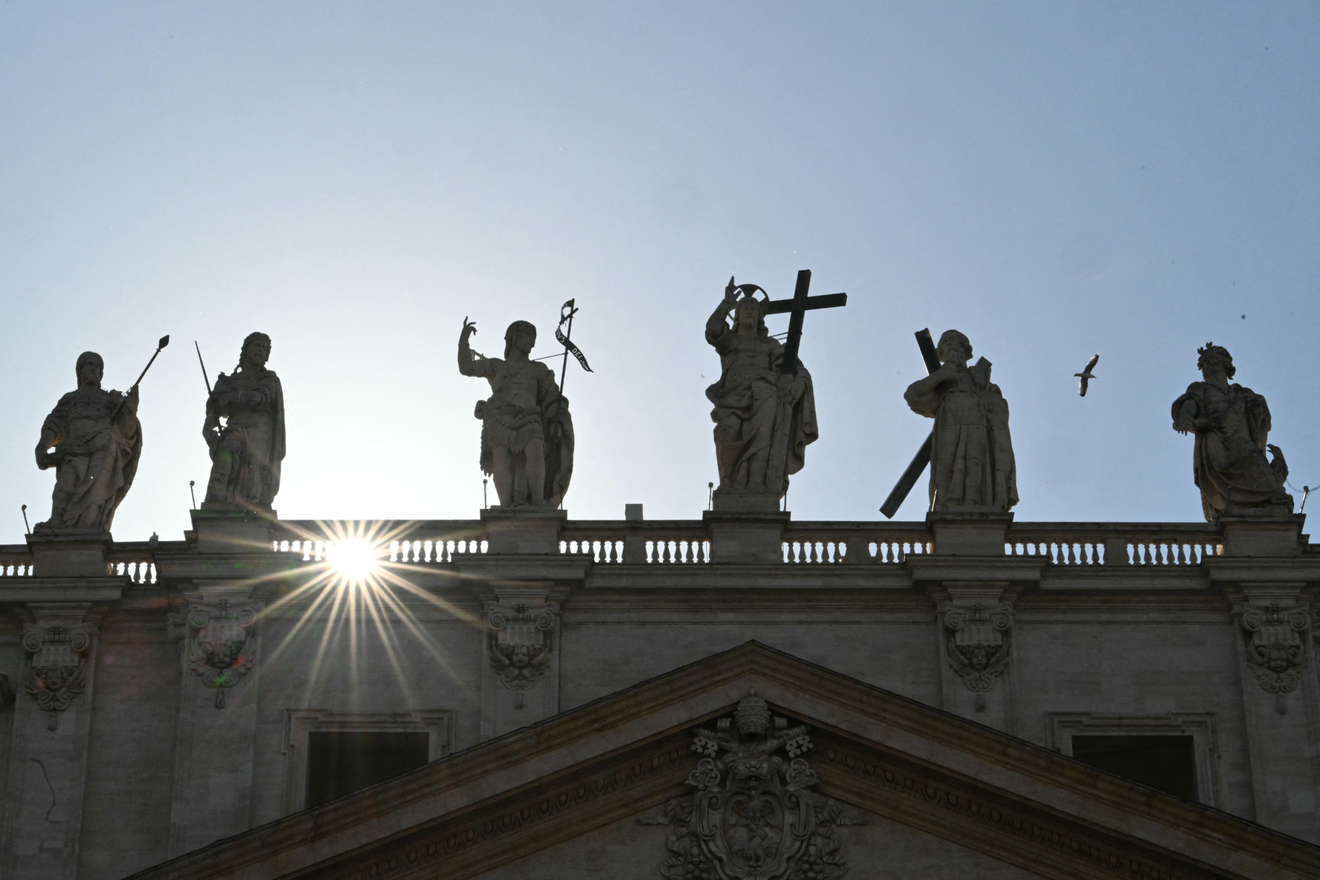 The sun sets behind the basilica at St Peter’s square on the second day of the conclave, at the Vatican, on May 8, 2025. (ALBERTO PIZZOLI/AFP via Getty Images)
