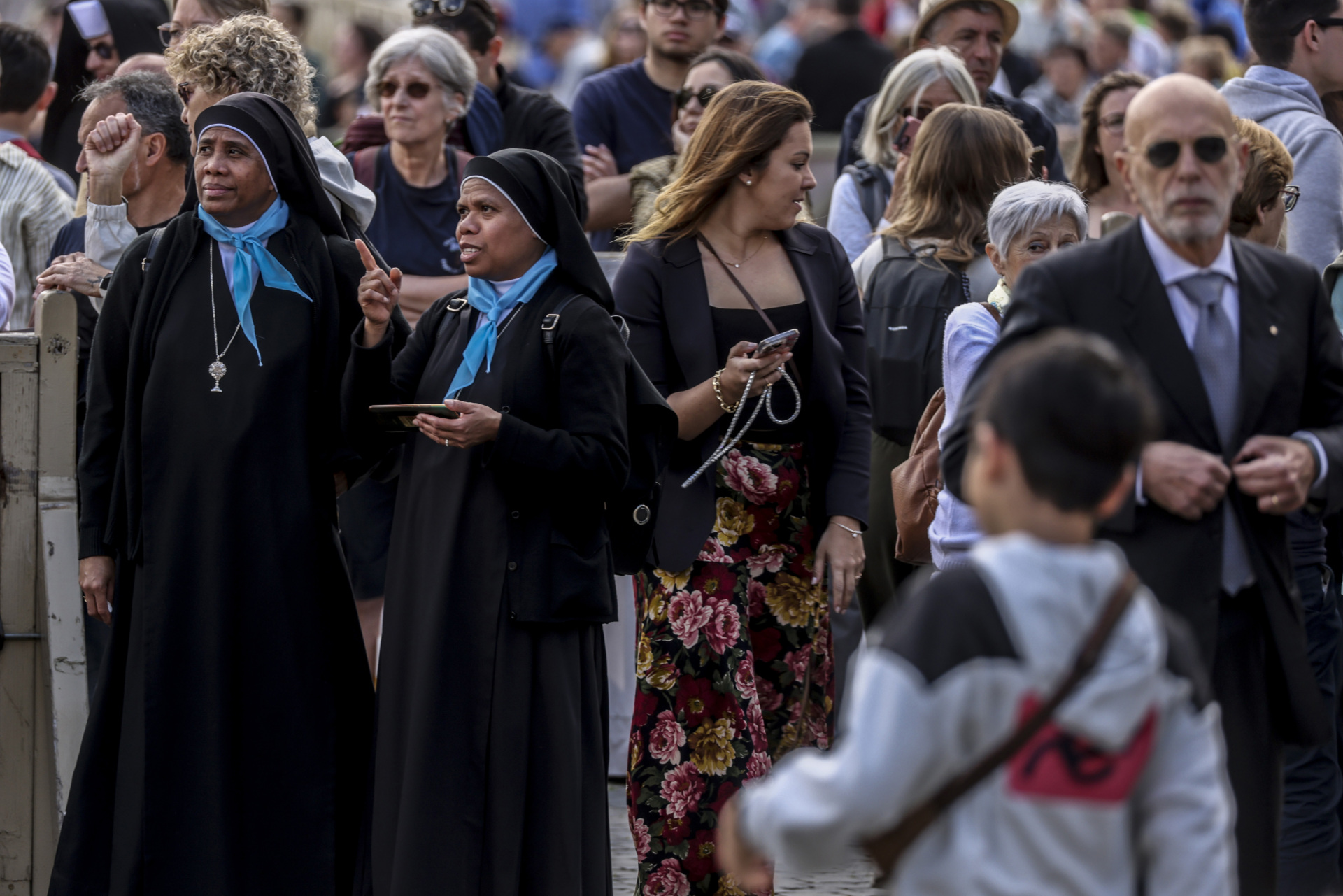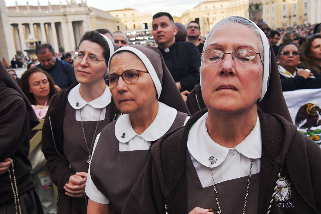 Nuns await for the election of the new Pope in St. Peter’s Square, during the second Day of the Conclave, on May 8, 2025 in Vatican City. (Alessandra Benedetti – Corbis/Corbis via Getty Images)