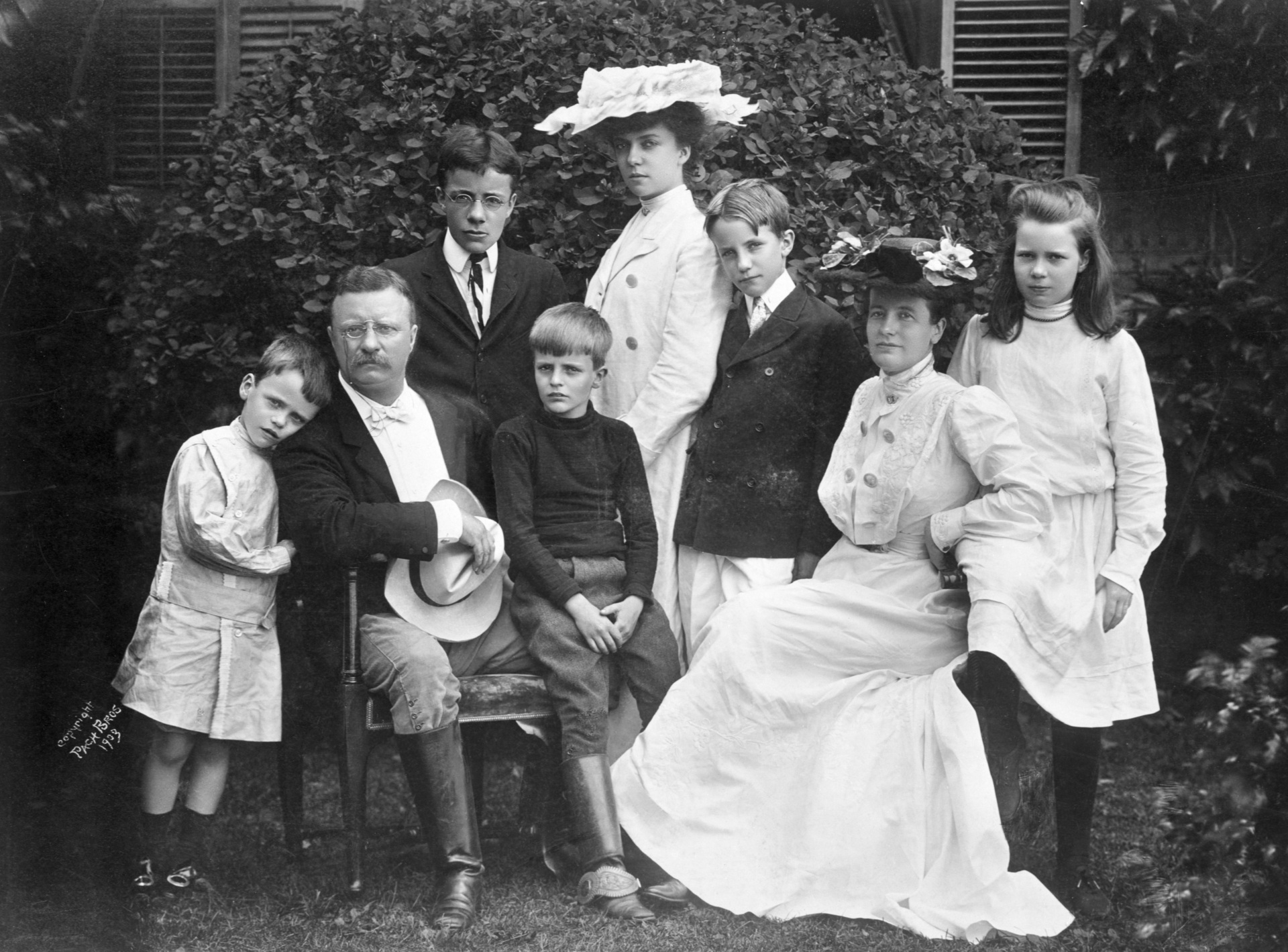President Theodore Roosevelt with his family circa 1903. From left to right: Quentin, Theodore Sr., Theodore Jr. (with glasses), Archie, Alice, Kermit, Mrs. Roosevelt, and Ethel. (Pach Brothers/CORBIS/Corbis via Getty Images)