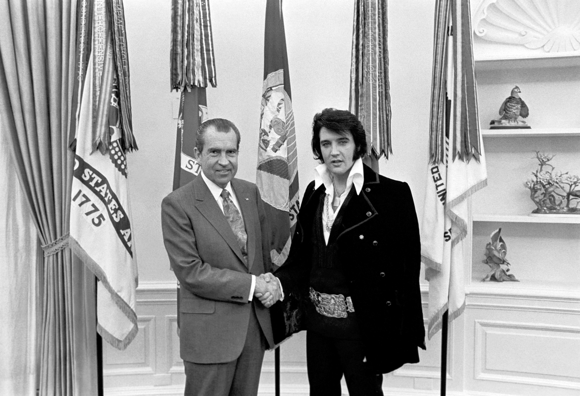 Nixon didn’t destroy the tapes, but he did shake hands with Elvis in the Oval Office on December 21, 1970, as seen in this iconic photo of “The President and the King.” (Pictures From History/Universal Images Group via Getty Images)