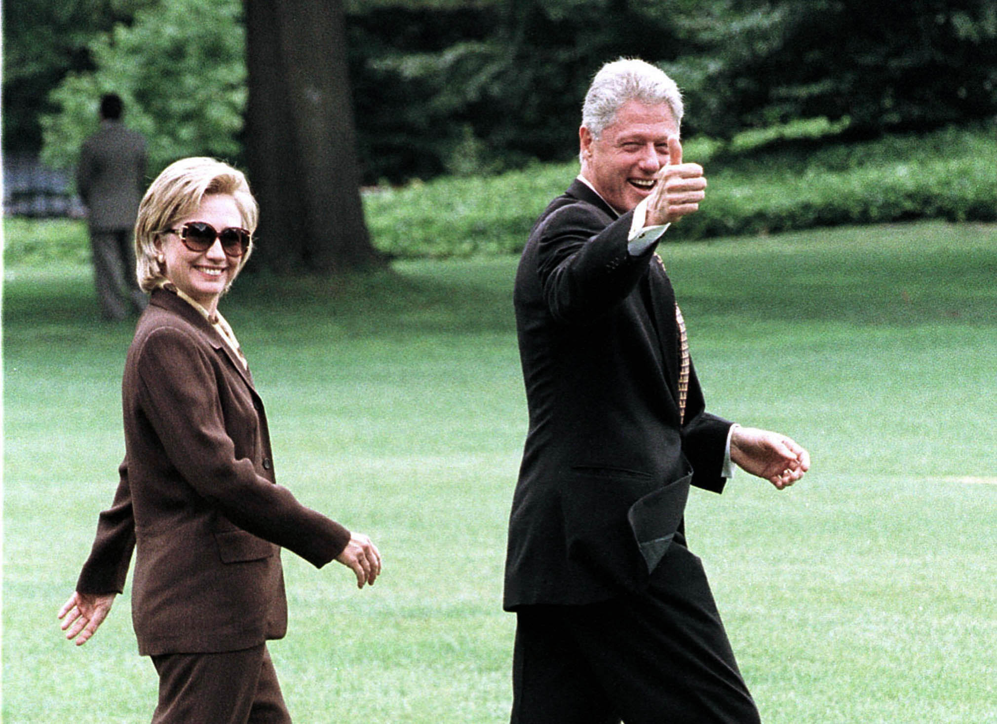 President Bill Clinton gives a thumbs up sign as he and First Lady Hillary Rodham Clinton walk to Marine One to depart for a weekend trip to the Hamptons on July 31, 1998. (Karin Cooper/Getty Images)
