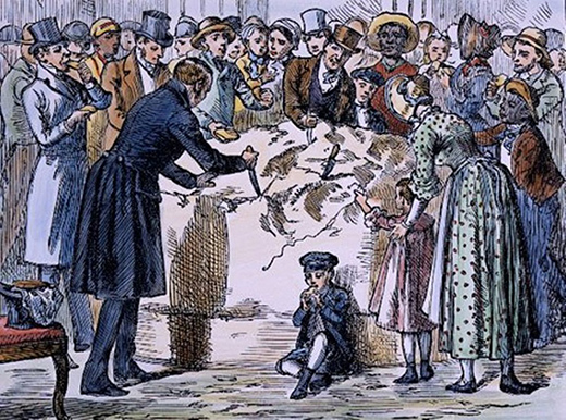 An illustration by Benjamin Perley Poore (1886) depicting the public enjoying Andrew Jackson’s 1,400 pound cheese block at the White House. (The Obama White House/National Archives)