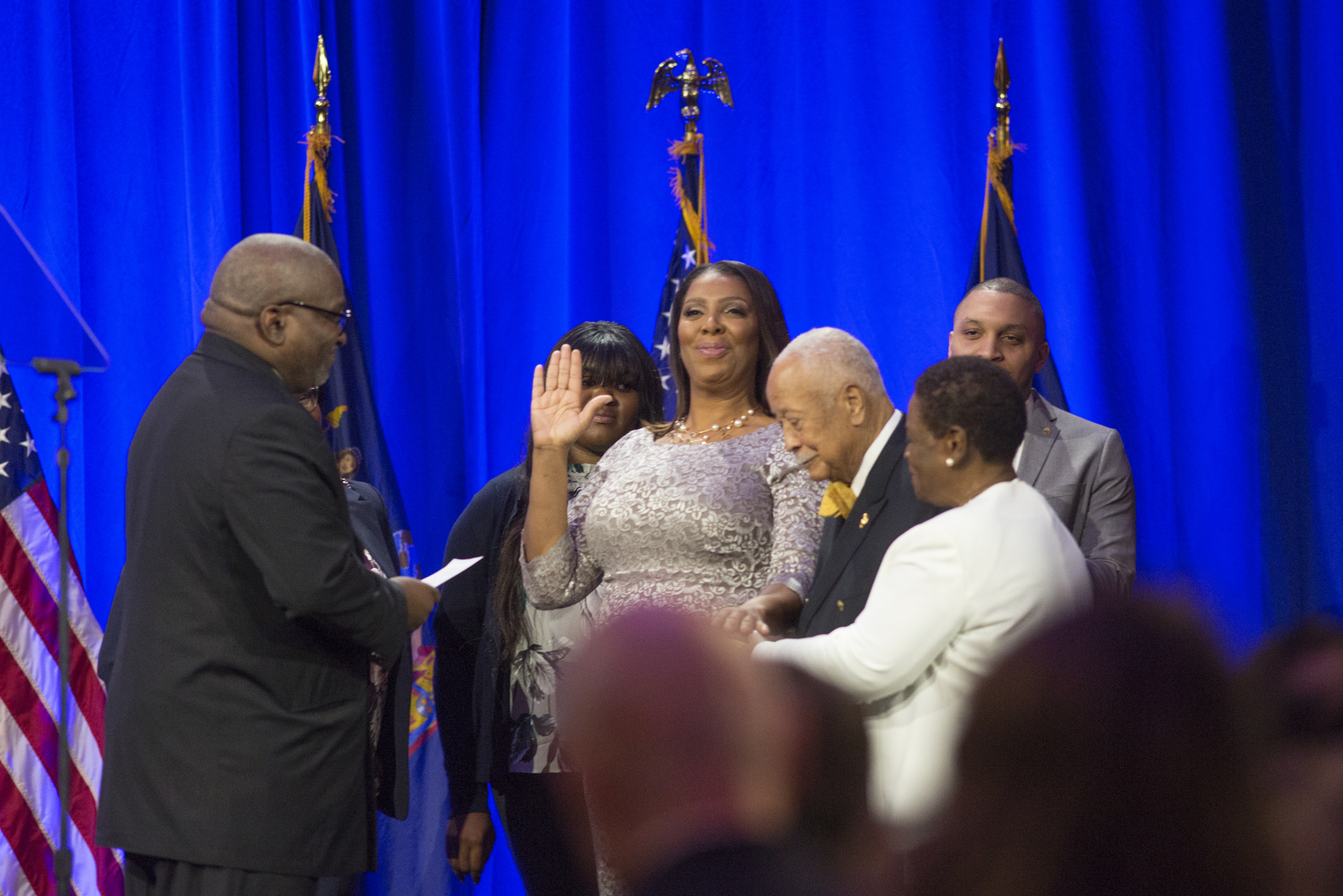 New York State’s recently elected Attorney General Letitia James takes the oath of office on January 1, 2019, on Ellis Island in New York City. (Andrew Lichtenstein/ Corbis via Getty Images)
