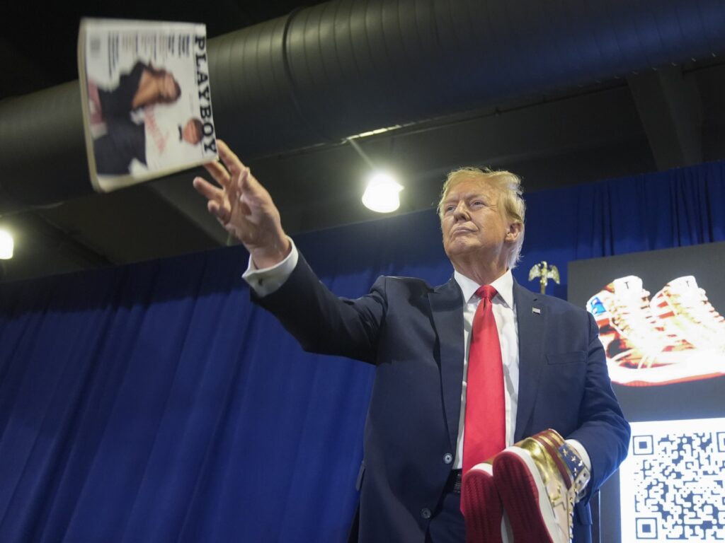 Republican presidential candidate former President Donald Trump catches a Playboy magazine before he autographed it at Sneaker Con Philadelphia, an event popular among sneaker collectors, in Philadelphia, Saturday, Feb. 17, 2024. (AP Photo/Manuel Balce Ceneta)