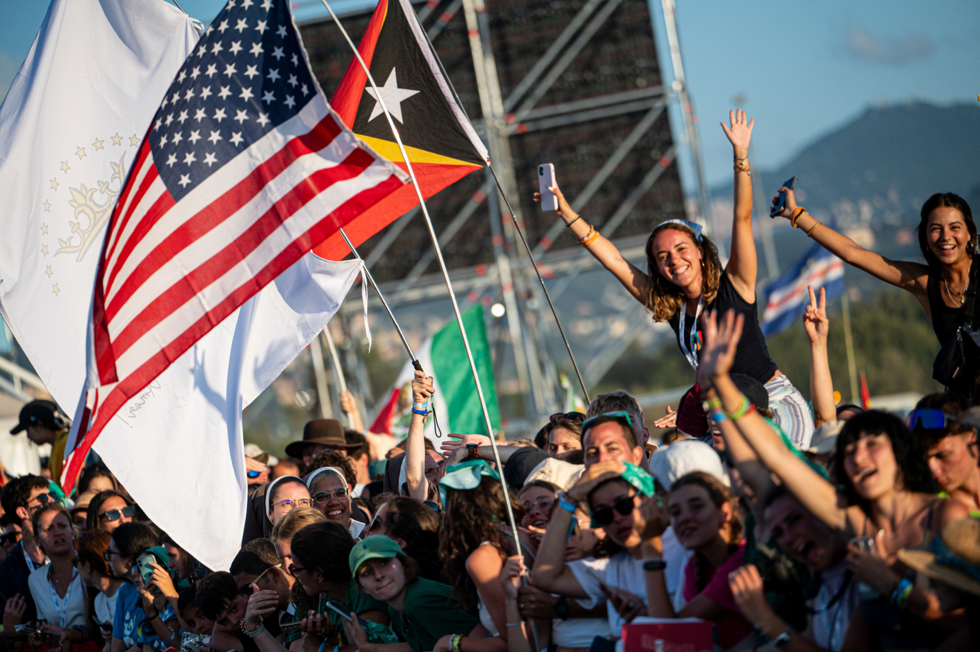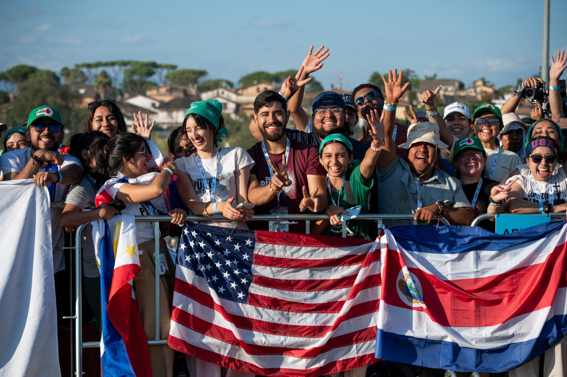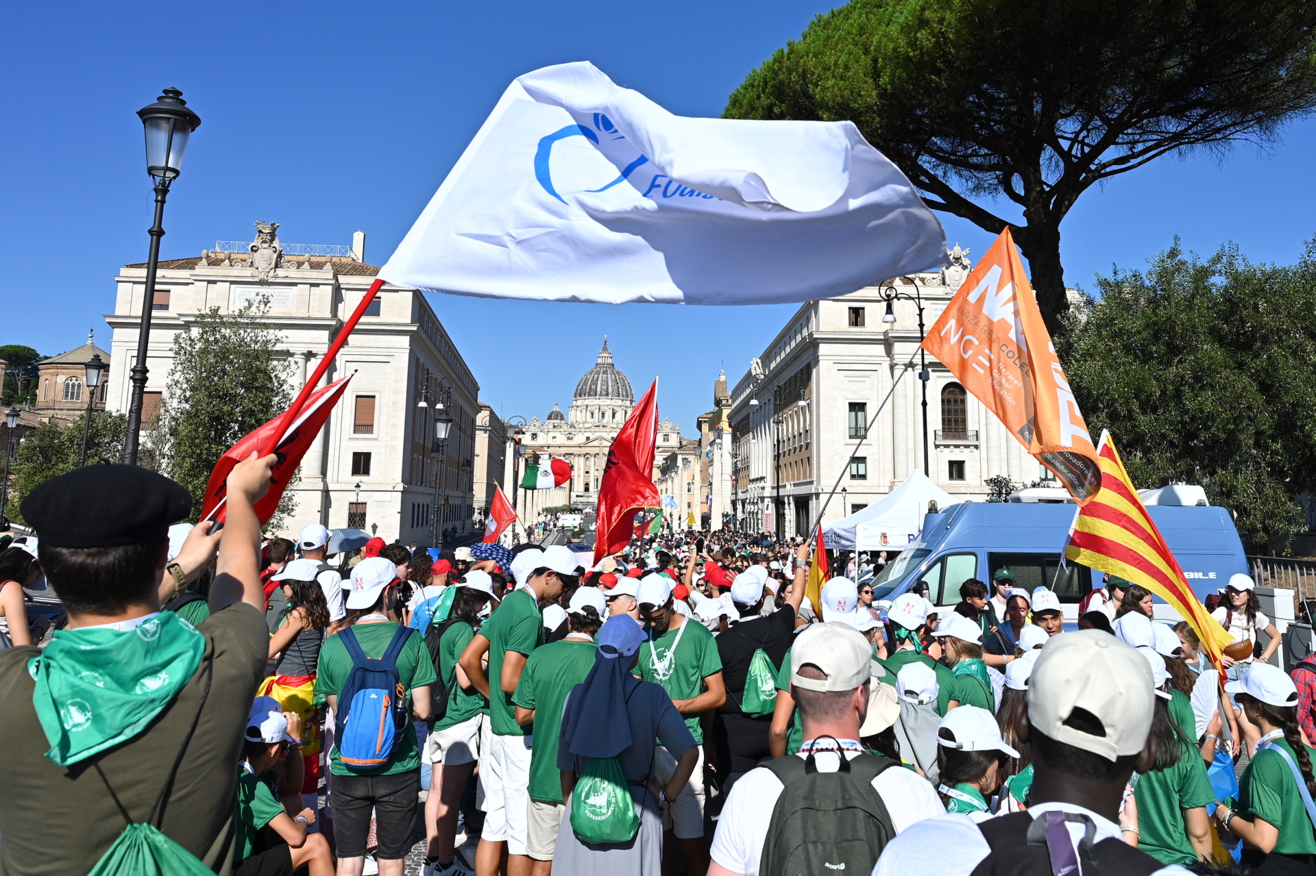 Young Catholic faithful and pilgrims wave flags as they gather to participate in the Jubilee of Youth in Rome on July 31, 2025. (ALBERTO PIZZOLI/AFP via Getty Images)
