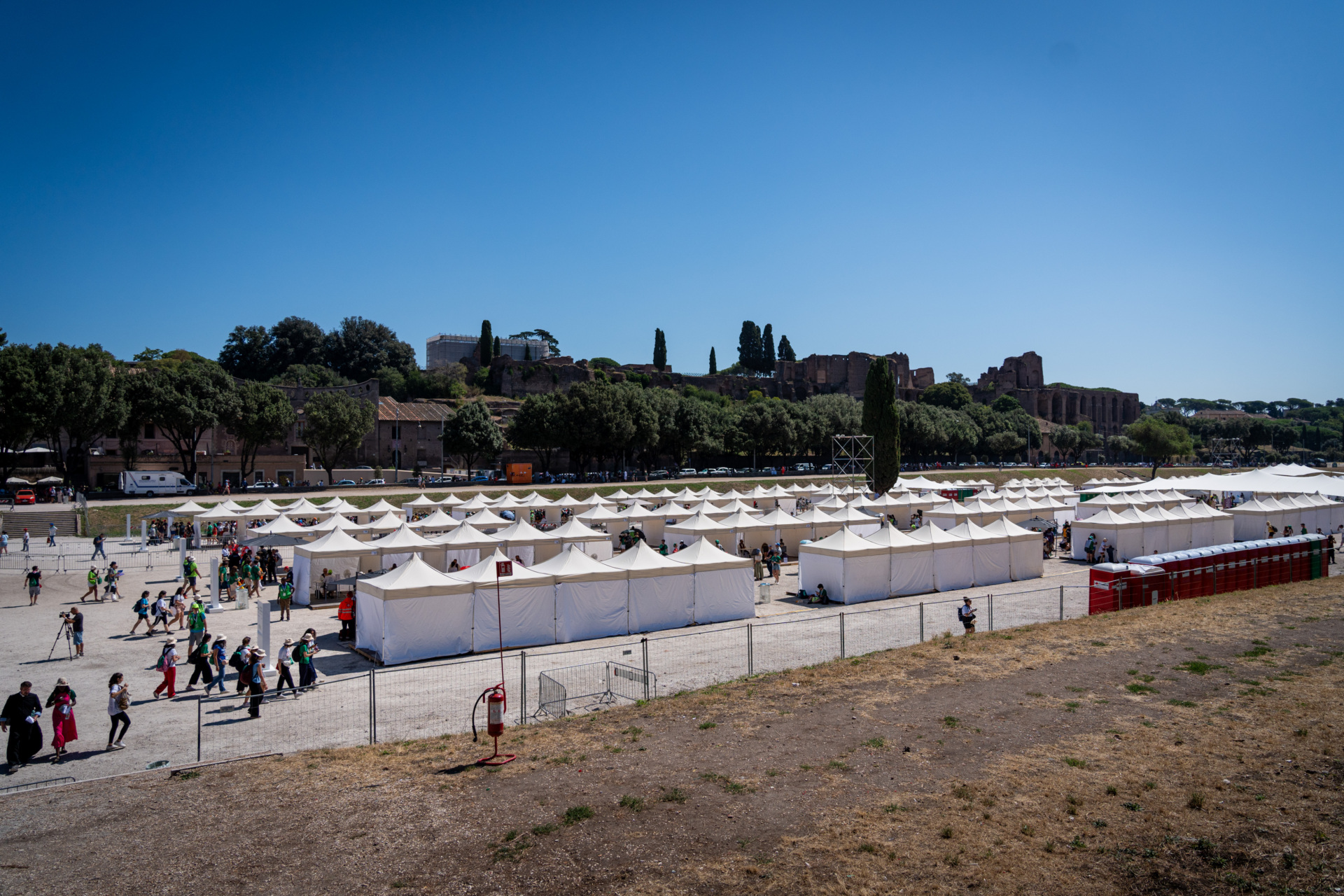General view of the Circus Maximus in Rome where tents were assembled as makeshift confessionals for Catholics to receive the sacrament of reconciliation as part of the Youth Jubilee on August 1, 2025. (Stefano Costantino/SOPA Images/LightRocket via Getty Images)