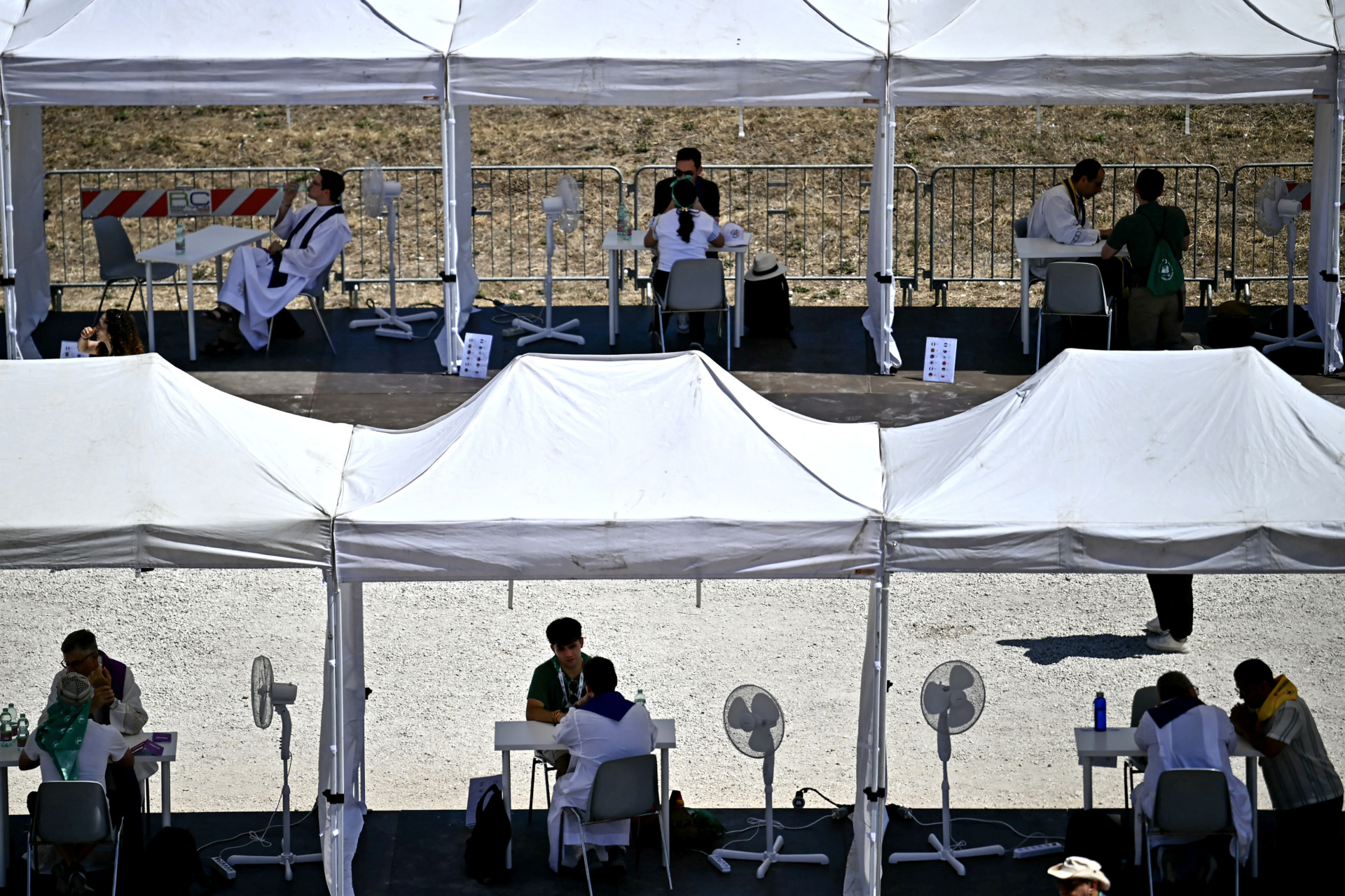 Priests hear confessions from young Catholics receiving the sacrament of reconciliation in makeshift confessionals set up at Rome’s Circus Maximus as part of the Youth Jubilee on August 1, 2025. (FILIPPO MONTEFORTE/AFP via Getty Images)