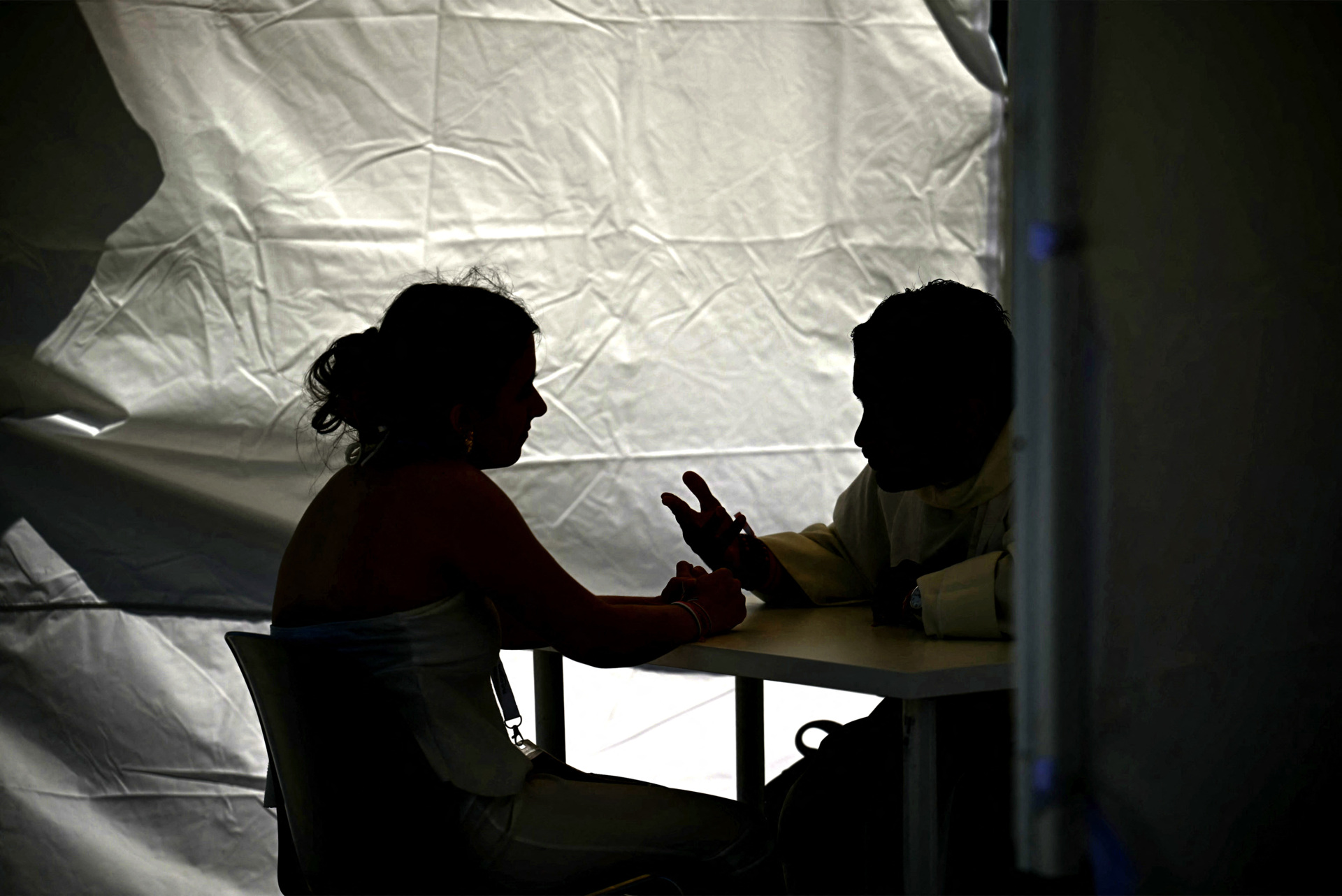 A priest talks to a young woman receiving the sacrament of reconciliation in a tent at the Circus Maximus as part of the Youth Jubilee in Rome on August 1, 2025. (FILIPPO MONTEFORTE/AFP via Getty Images)