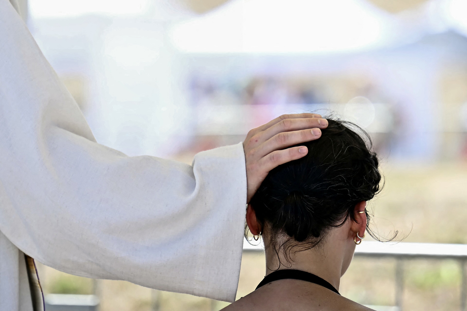 A priest offers absolution to a young woman who received the sacrament of reconciliation in a makeshift confessional in the Circus Maximus in Rome as part of the Youth Jubilee on August 1, 2025. (FILIPPO MONTEFORTE/AFP via Getty Images)