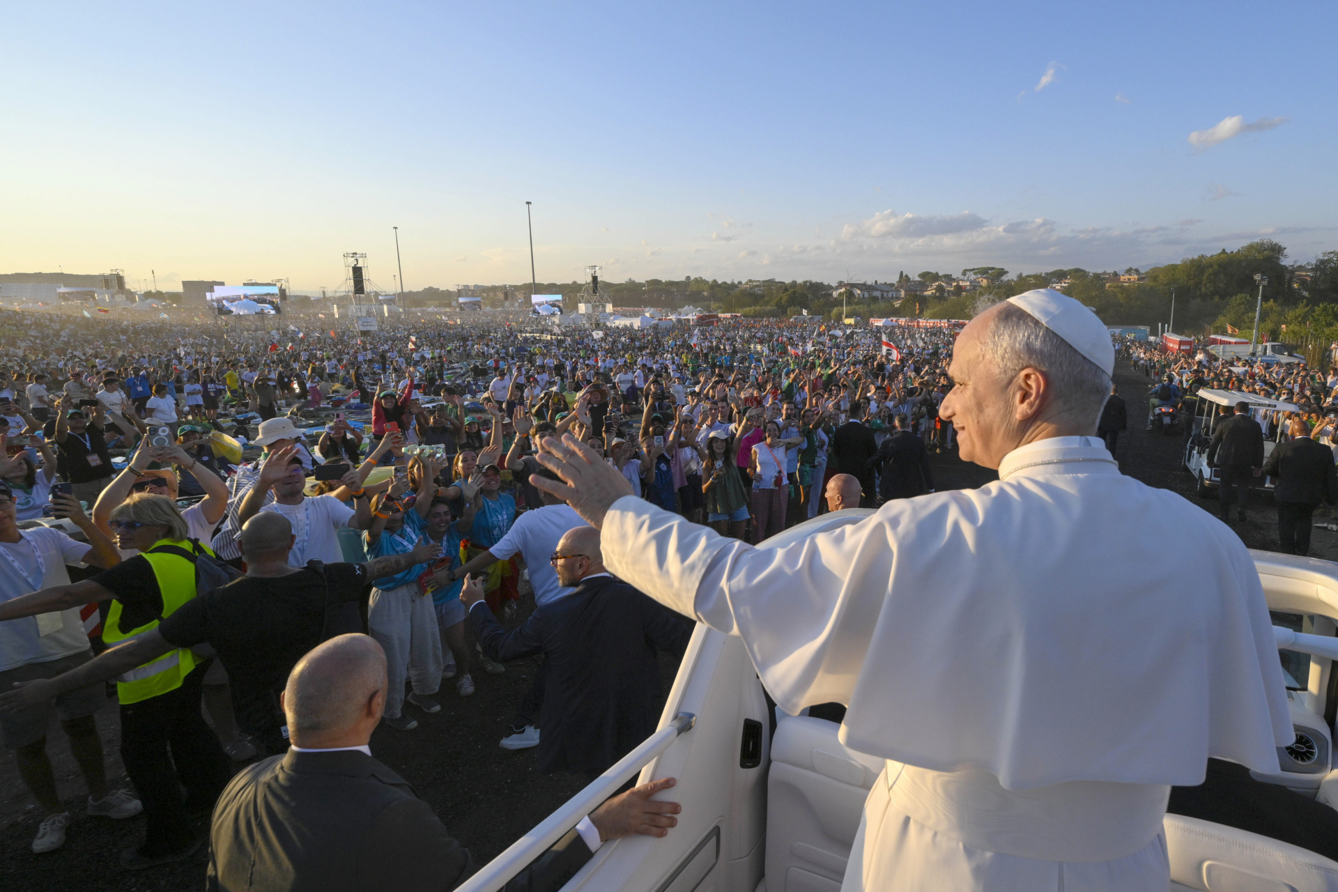 Pope Leo XIV waves to the young people gathered in Tor Vergata, on the outskirts of Rome, for the Jubilee of Youth prayer vigil on August 2, 2025 in Rome, Italy. (Simone Risoluti – Vatican Media via Vatican Pool/Getty Images)