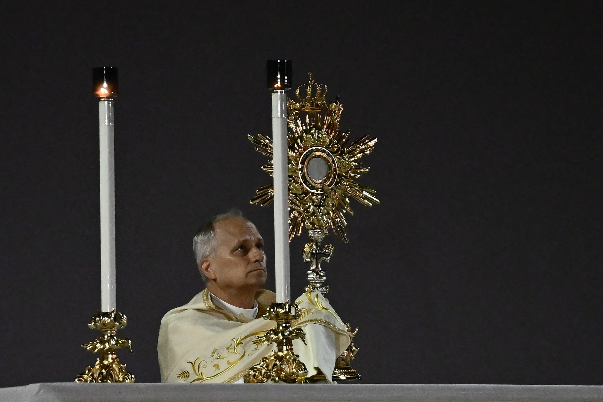 Pope Leo XIV holds the monstrance aloft as he leads a prayer vigil before Sunday Mass as part of the Jubilee of Youth, in Rome’s eastern Tor Vergata neighbourhood on August 2, 2025. (FILIPPO MONTEFORTE/AFP via Getty Images)