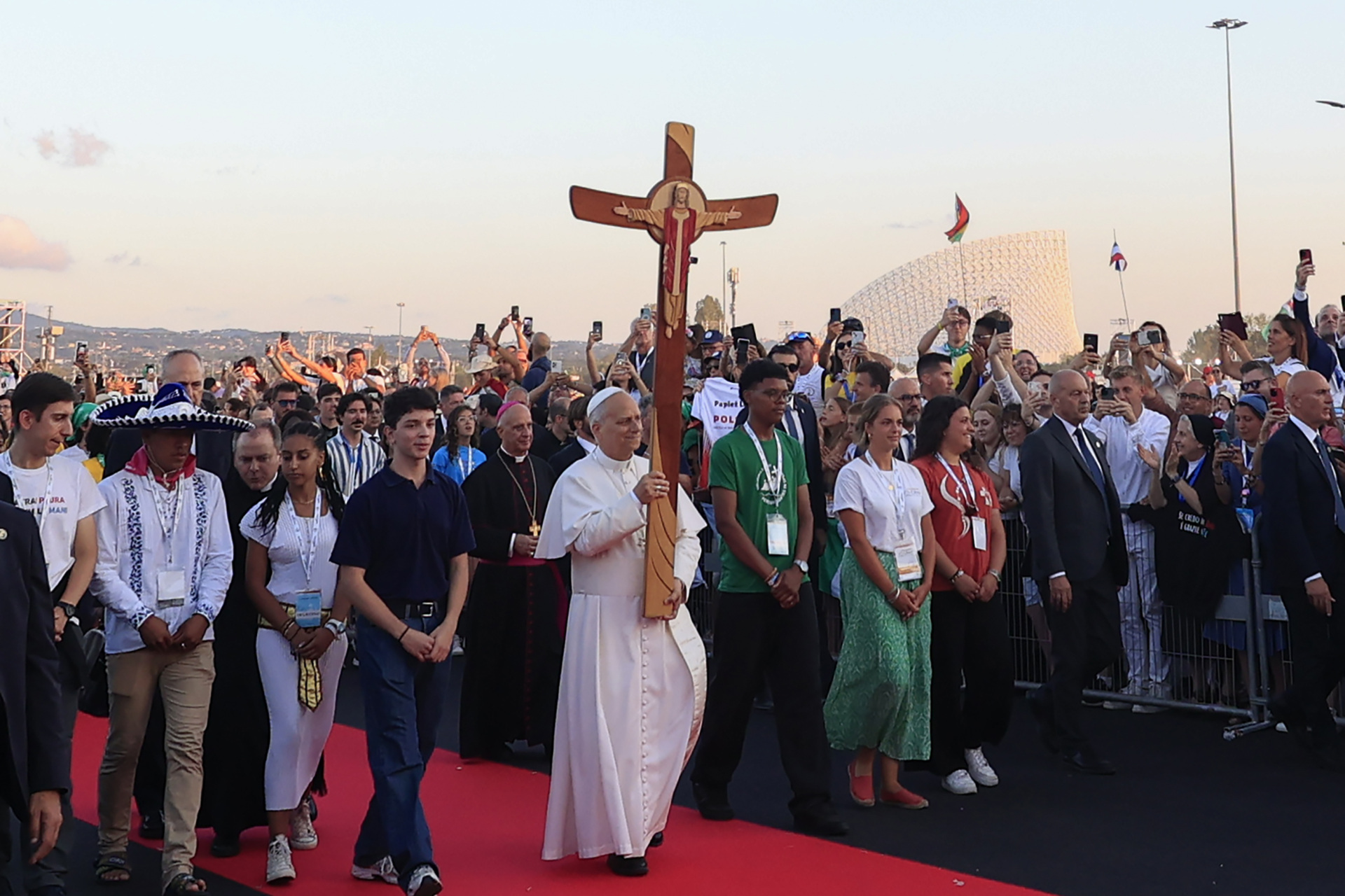 Pope Leo XIV carries the cross surrounded by young Catholics from around the world as he leads a vigil prayer for the Jubilee of Youth at Tor Vergata, on the outskirts of Rome, Italy, on August 2, 2025. (Riccardo De Luca/Anadolu via Getty Images)
