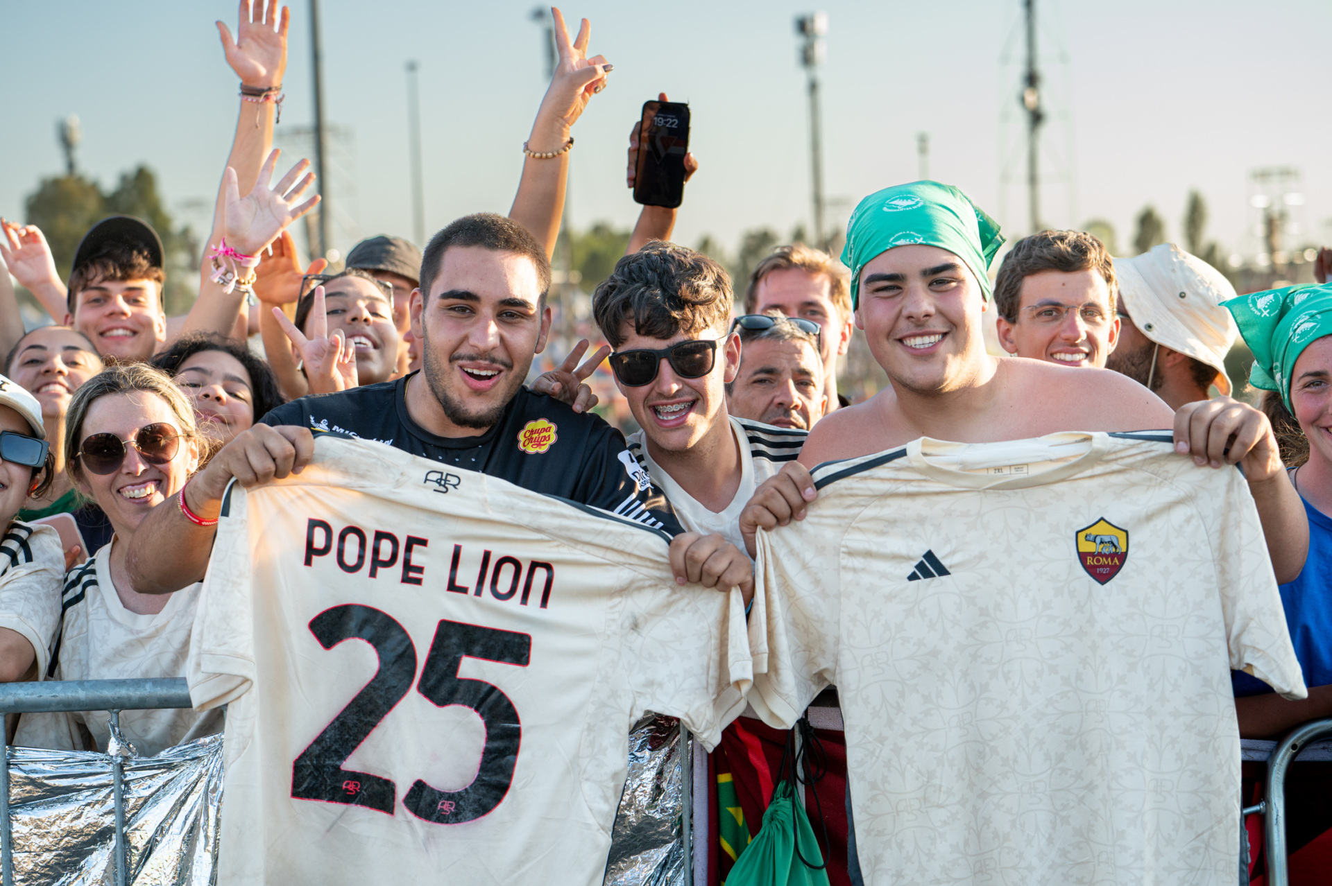 A group of pilgrims wearing shirts of the football club AS Roma with the name of the Pope waits for the beginning of Pope Leo XIV’s vigil prayer for the Jubilee of Youth at Tor Vergata, on the outskirts of Rome, Italy, on August 2, 2025. (Massimo Valicchia/NurPhoto via Getty Images)