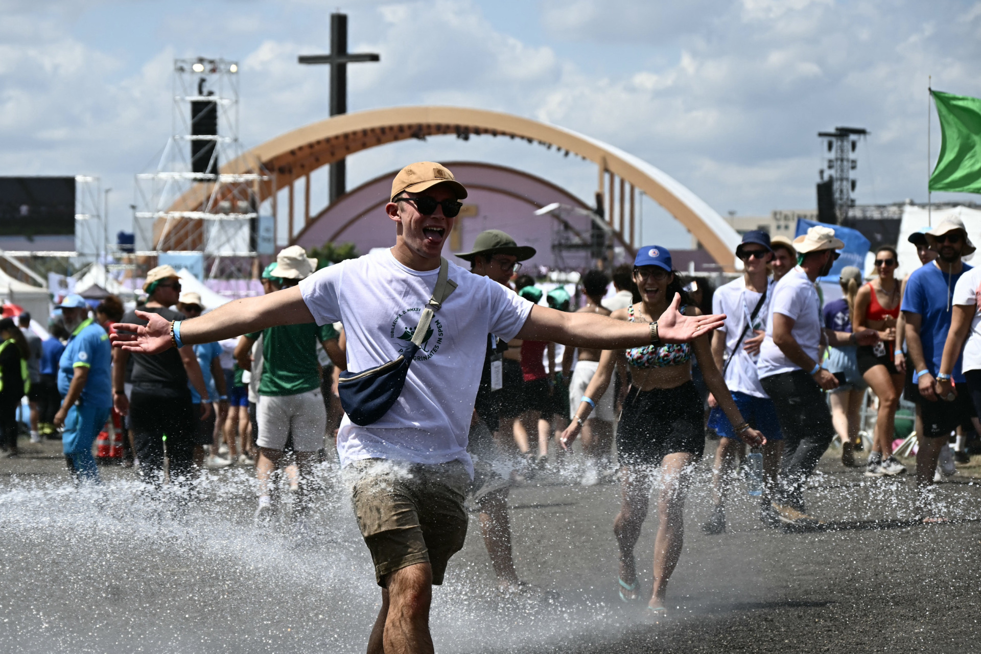 Attendees get hosed down to cool off as youth and pilgrims gather in Rome’s eastern Tor Vergata neighbourhood for a prayer vigil led by the Pope before Sunday’s Mass as part of the Jubilee of Youth, on August 2, 2025. (FILIPPO MONTEFORTE/AFP via Getty Images)