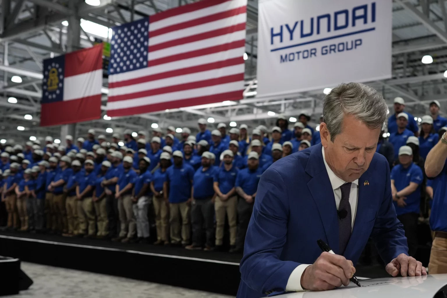 Gov. Brian Kemp (R-GA) signs an IONIQ 9 EV vehicle during a media tour and grand opening at the Hyundai Motor Group Metaplant America on Wednesday, March 26, 2025, in Ellabell, Georgia. (AP Photo/Mike Stewart)
