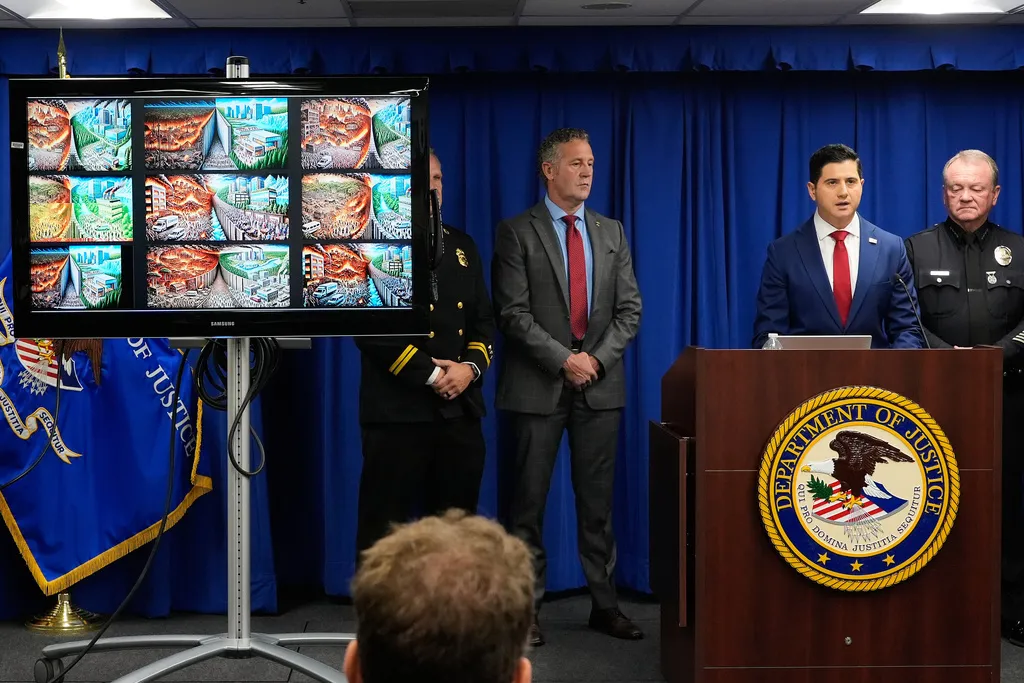Acting U.S. Attorney Bill Essayli, middle, gestures while speaking during a news conference announcing an arrest made in the Palisades Fire, Wednesday, Oct. 8, 2025, in Los Angeles.