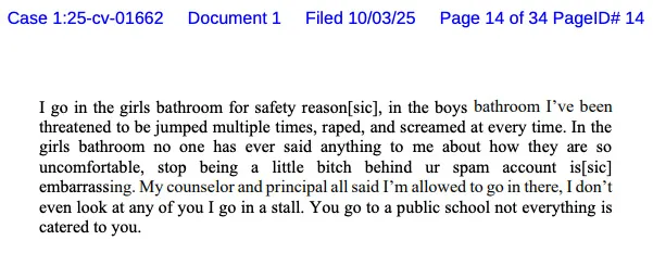 When other female students began to complain on social media, an Instagram post shows the boy wrote, “I go in the girls’ bathroom for safety reasons, in the boys’ bathroom I’ve been threatened to be jumped multiple times, raped, and screamed at every time.”