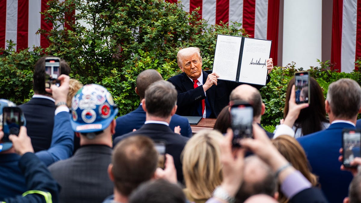 President Donald Trump signs two executive orders during a Make America Wealthy Again event in the White House Rose Garden on Wednesday, April 2, 2025. (Demetrius Freeman/The Washington Post via Getty Images)