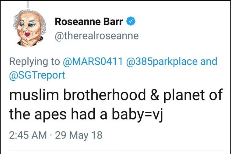 “ABC decided to cancel their highest rated show ‘Roseanne’ following a tweet in which Roseanne compared an African-American woman, a former advisor to President Obama to an ape, which did not sit well with ABC management or anyone with a brain, really.”