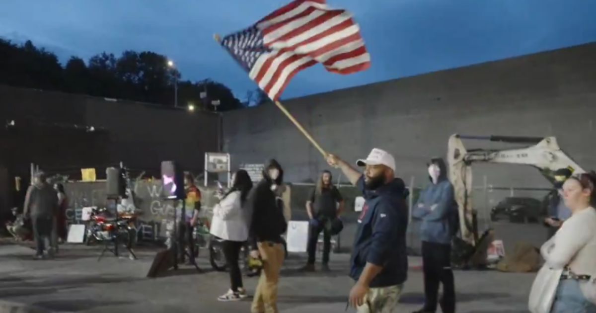 Meanwhile, a separate video of the incident showed the equalizer peacefully waving his American flag. One masked antifa protester, undoubtedly confused by actual courage, insisted that the equalizer “should be on the right side.”