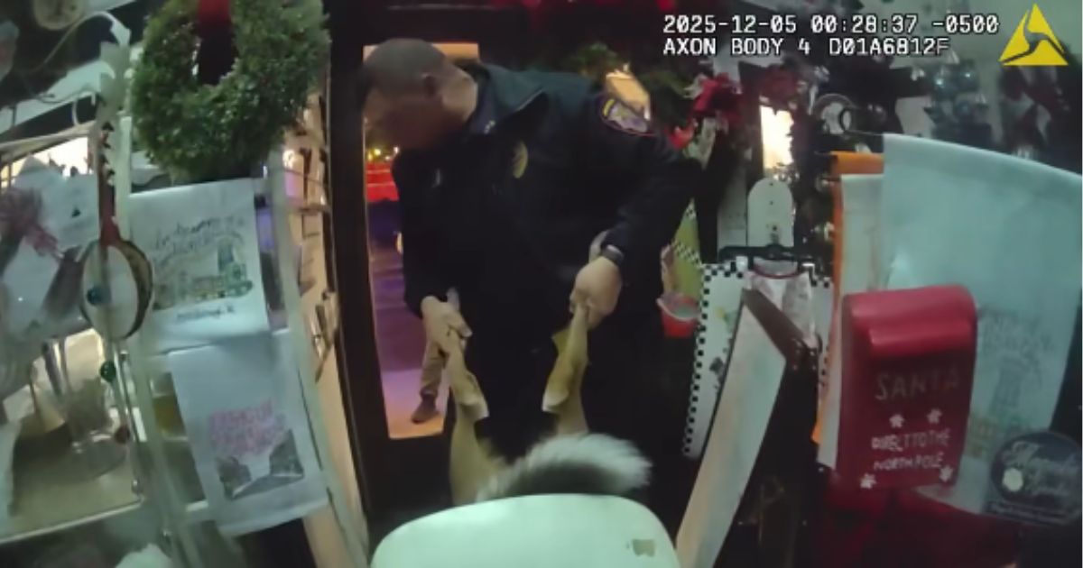 Police shared a body cam video showing officers entering the store and finding the deer stuck at the scene.