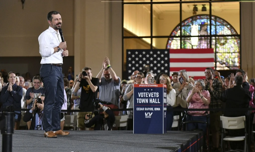 Pete Buttigieg, former transportation secretary, takes the stage during a VoteVets town hall in Cedar Rapids, Iowa, Tuesday, May 13, 2025. (AP Photo/Cliff Jette)