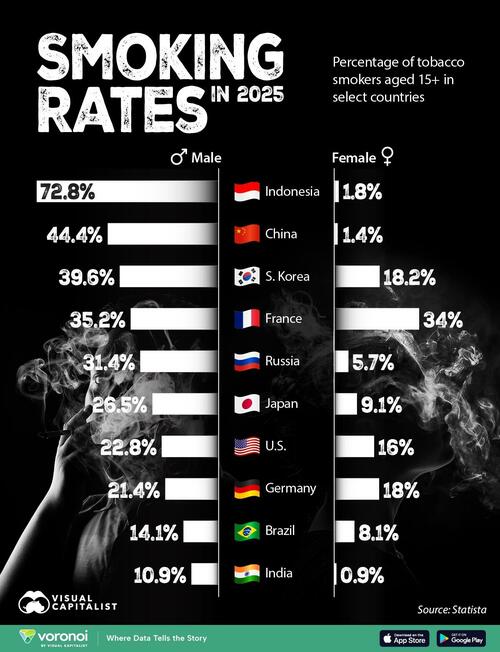 The graphic below, via Visual Capitalist's Marcus Lu, highlights the male and female smoking rates in ten major countries. The data is based on projections compiled by Statista.